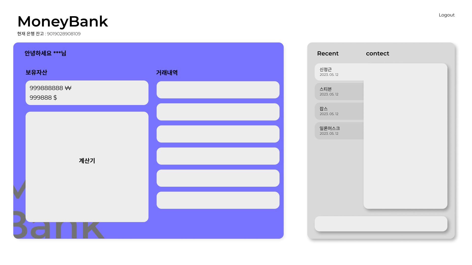 목차 https://github.com/sjk990515/moneyBank GitHub - sjk990515/moneyBank Contribute to sjk990515/moneyBank development by creating an account on GitHub. github.com 공유하기 게시글 관리 신정근 개발일지 저작자표시 (새창열림) '프로젝트' 카테고리의 다른 글 Todolist-modal (typescript, react-query) (0) 2023.04.10 SteamPlus(화상채팅프로그램) (0) 2023.03.13 목차 목차 닫기